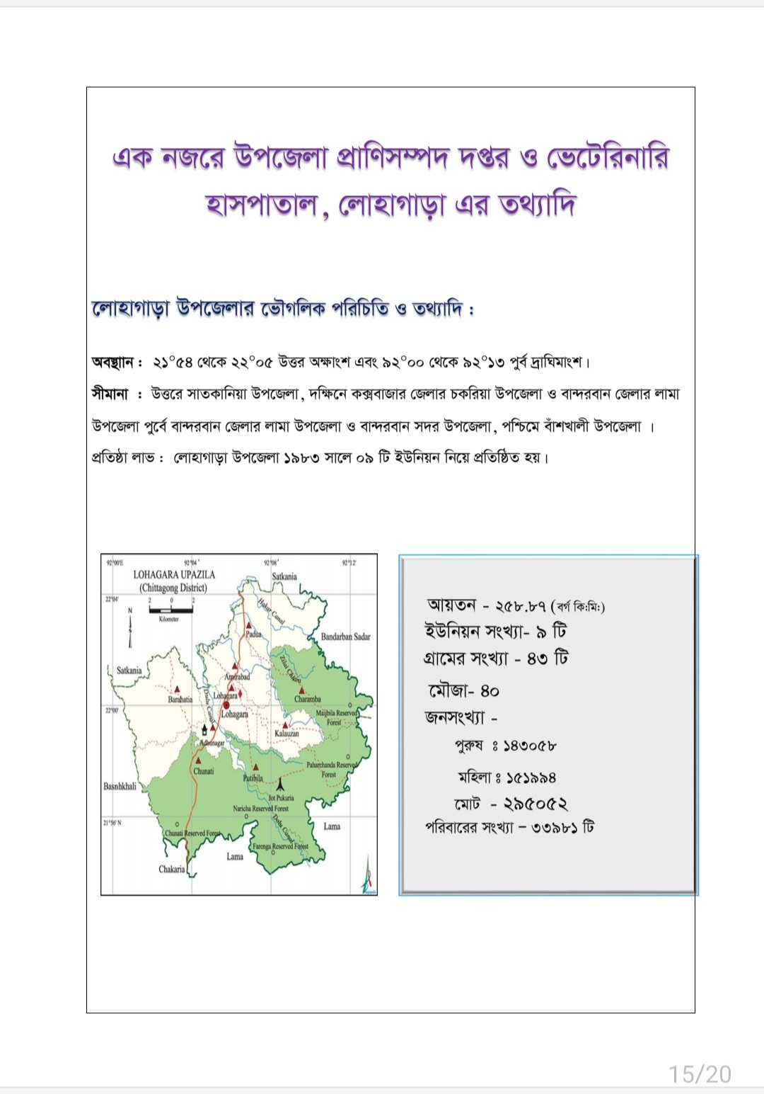 চট্টগ্রাম জেলার সর্ব দক্ষিনে পাহাড়ঘেরা বাংলাদেশের ঐতিহ্যবাহী জনপদ লোহাগাড়া উপজেলা। প্রাকৃতিক সৌন্দর্য, কৃষি, শিক্ষা, ও সংস্কৃতিতে সমৃদ্ধ এই উপজেলা প্রাণিসম্পদ একটি সম্ভাবনাময় খাত। আত্মকর্মসংস্থান, দারিদ্র্য বিমোচন, আমিষ জাতীয় খাদ্যের যোগান বৃদ্ধির জন্য নিরলসভাবে লোহাগাড়া উপজেলা কাজ করে যাচ্ছে । এই উপজেলায় দেশ ডেইরি, কে. টি. এন, বাহার, আলিফ এগ্রোর মত বাংলাদেশে নেতৃত্বদানকারী খামার গড়ে উঠেছে। অধিবাসির অনেকেই গবাদি পশুরখামার স্থাপন, ছাগল পালন, হাঁস-মুরগীর খামার প্রতিষ্ঠানকে অর্থনৈতিক আয় ও জীবিকা নির্বাহের মাধ্যম হিসেবে গ্রহণ করেছেন। প্রাণিসম্পদ বিভাগ এই উপজেলায় জনসাধারণকে সম্পৃক্ত করে উন্নয়নের লক্ষ্যে কাজ করে যাওয়ার জন্য দৃঢ়প্রতিজ্ঞ। উপজেলা প্রাণিসম্পদ কর্মকর্তা, লোহাগাড়া, চট্টগ্রাম অতীতের ধারাবাহিকতায় আগামী দিনে ও জনমানুষকে অধিকতর মানসম্পন্ন সেবা প্রদানের মাধ্যমে নিরাপদ দুধ ,ডিম ও মাংস উৎপাদন বৃদ্ধিতে এ দপ্তর অঙ্গীকারবদ্ধ।